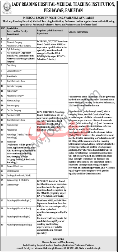 Lady Reading Hospital is hiring professors and assistant professors across various medical specialties. These vacancies include senior and specialized roles in fields such as psychiatry, ENT, rheumatology, cardiac surgery, pathology, orthopedics, anesthesia, pediatric surgery, nephrology, radiology, thoracic surgery, dermatology, vascular surgery, pediatric ICU, neurosurgery, general surgery, pediatrics, neonatal care, neurology, adult intensive care, plastic surgery, gynecology obstetrics, urology, general medicine, and ophthalmology.