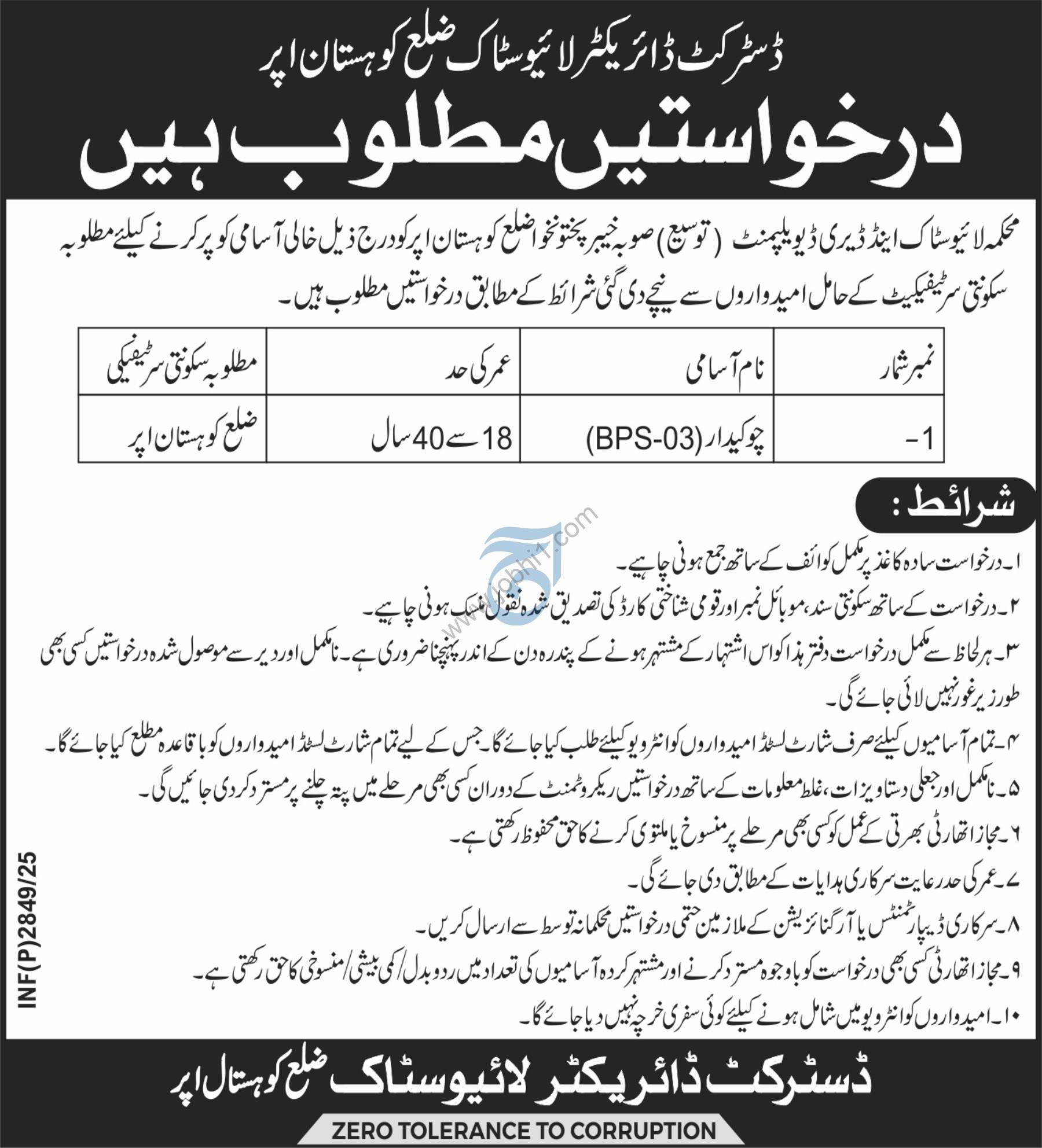 Tagged as: Aaj Newspaper Jobs, Full Time Jobs, Government Jobs, Government Security Jobs, Jobs in Khyber Pakhtunkhwa, Jobs in Kohistan, Jobs in Livestock Department, Kohistan Jobs, KPK Jobs, latest government jobs Pakistan, Livestock and Dairy Development Department Jobs, Matric Pass Jobs, Middle Pass Jobs, Primary Pass Jobs, Public sector jobs, Security Jobs