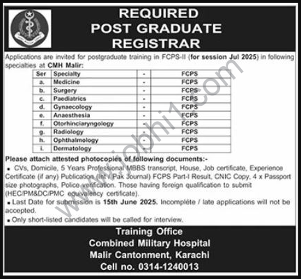 Combined Military Hospital CMH in Malir Cantonment, Karachi, is inviting applications for multiple full-time registrar positions across various medical specialties. These are government medical jobs offering a valuable opportunity to work in a well-established healthcare institution.