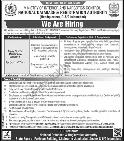This is a great opportunity to join NADRA and contribute to national development. If you meet the qualifications and have relevant experience, make sure to apply before the 22 June 2025 deadline or as specified in the newspaper ad.