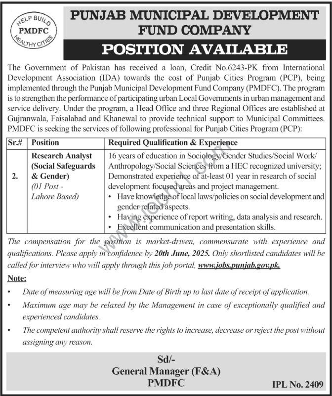Login to Send MessagePunjab Municipal Development Fund Company (PMDFC) is inviting online applications for multiple research-related posts in Lahore, Punjab. These latest government jobs at PMDFC offer excellent opportunities for candidates with a Master’s degree and a passion for research in social safeguards and gender analysis. If you are looking for full-time research jobs in Upper Mall Lahore, this could be the right fit for you.