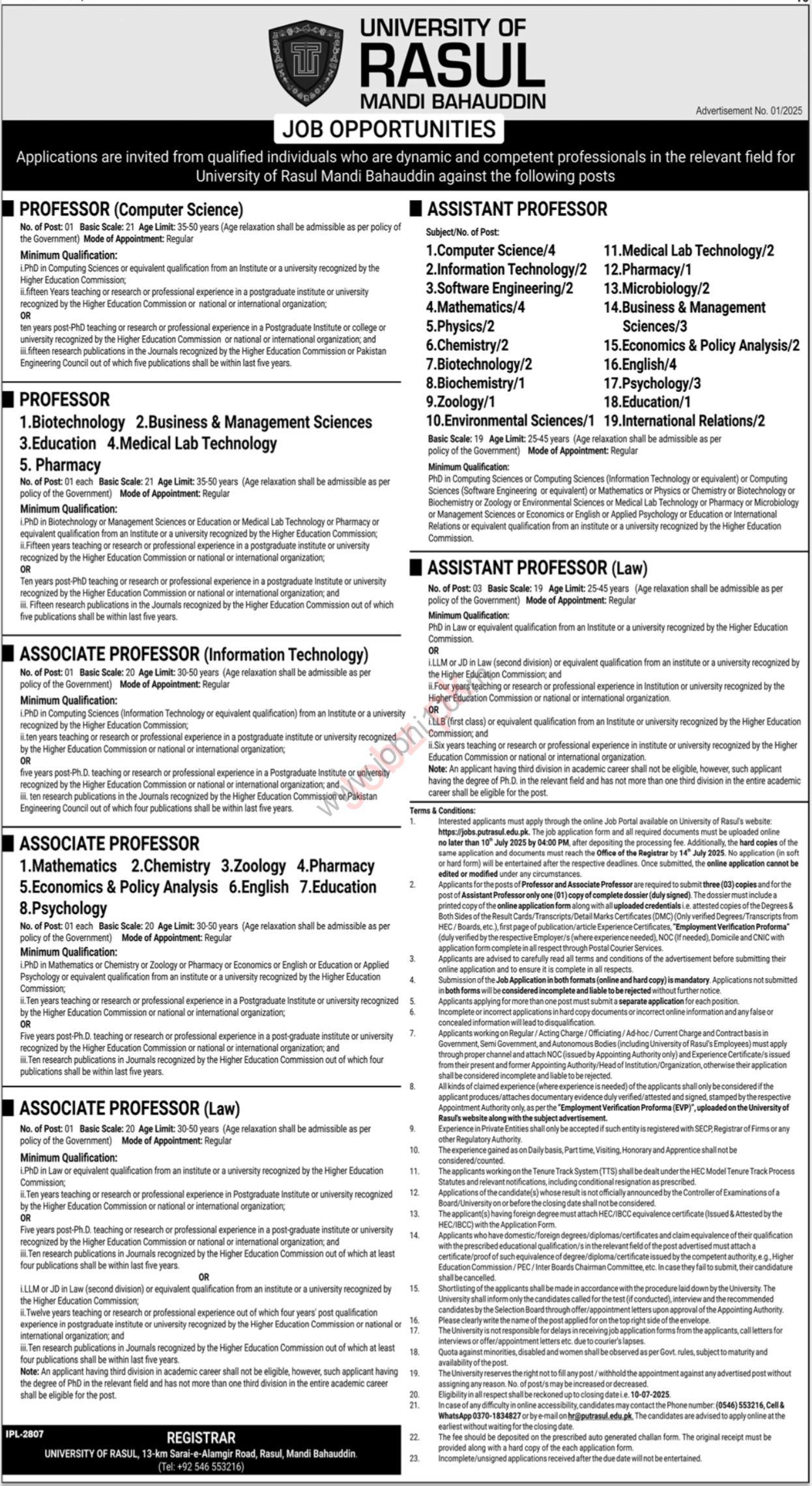 Published in the Jang Newspaper on 23 June 2025, these vacancies are open to candidates with Master’s, MPhil, PhD, or MS degrees and at least 2 years of teaching or academic experience.